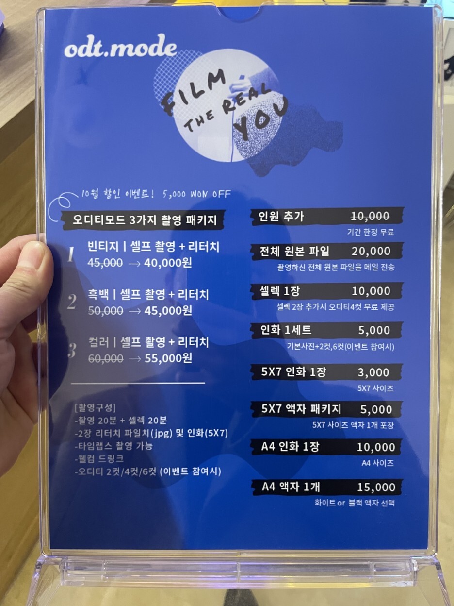 성수 셀프사진관 오디티모드의 가격은 위와 같아요!